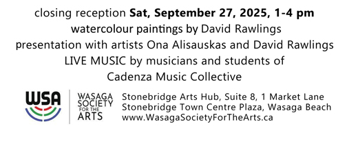The Wasaga Society for the Arts is a registered Canadian Charity. The Society’s purpose is to advance the public’s appreciation of the arts by producing public art exhibitions, presentations and performance arts events, and by providing a forum for artists to exhibit, present or perform their artistic works through participation in such events.