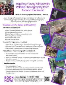 Jason George is a local wildlife photographer, inspiring presenter, teacher, and wildlife adventurer. He infects his audiences with a love for nature and creativity through captivating and thought-provoking stories and immersive activities. Jason is giving his popular and fun presentation, ‘Challenging Perspectives’ .
